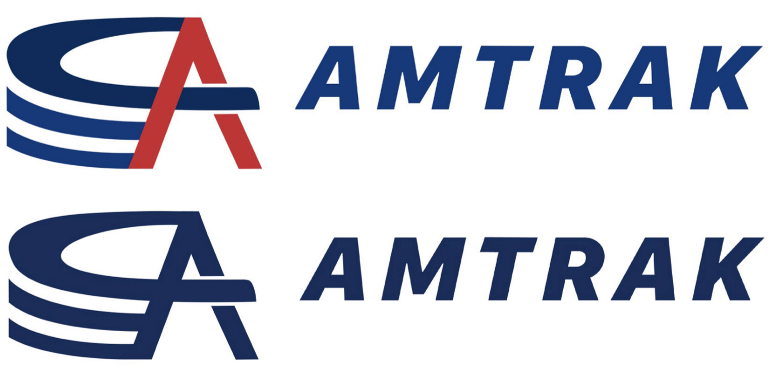 Amtrak’s logomark is pictured in two variations: full color and Sleeper Blue. Both variations are to be used against a light background. The choice of full color or Sleeper Blue is left to the discretion of corporate design teams on a case-by-case basis with a few exceptions. The full color variation is always to be used on informational screens inside Amtrak train cars and in all email correspondence; the Sleeper Blue variation is always to be used on business cards and physical train booklets and brochures. When working with a dark background, the logomark is to appear in white. The logomark can stand alone; a standalone logomark may work well when facing potential scaling visibility issues.