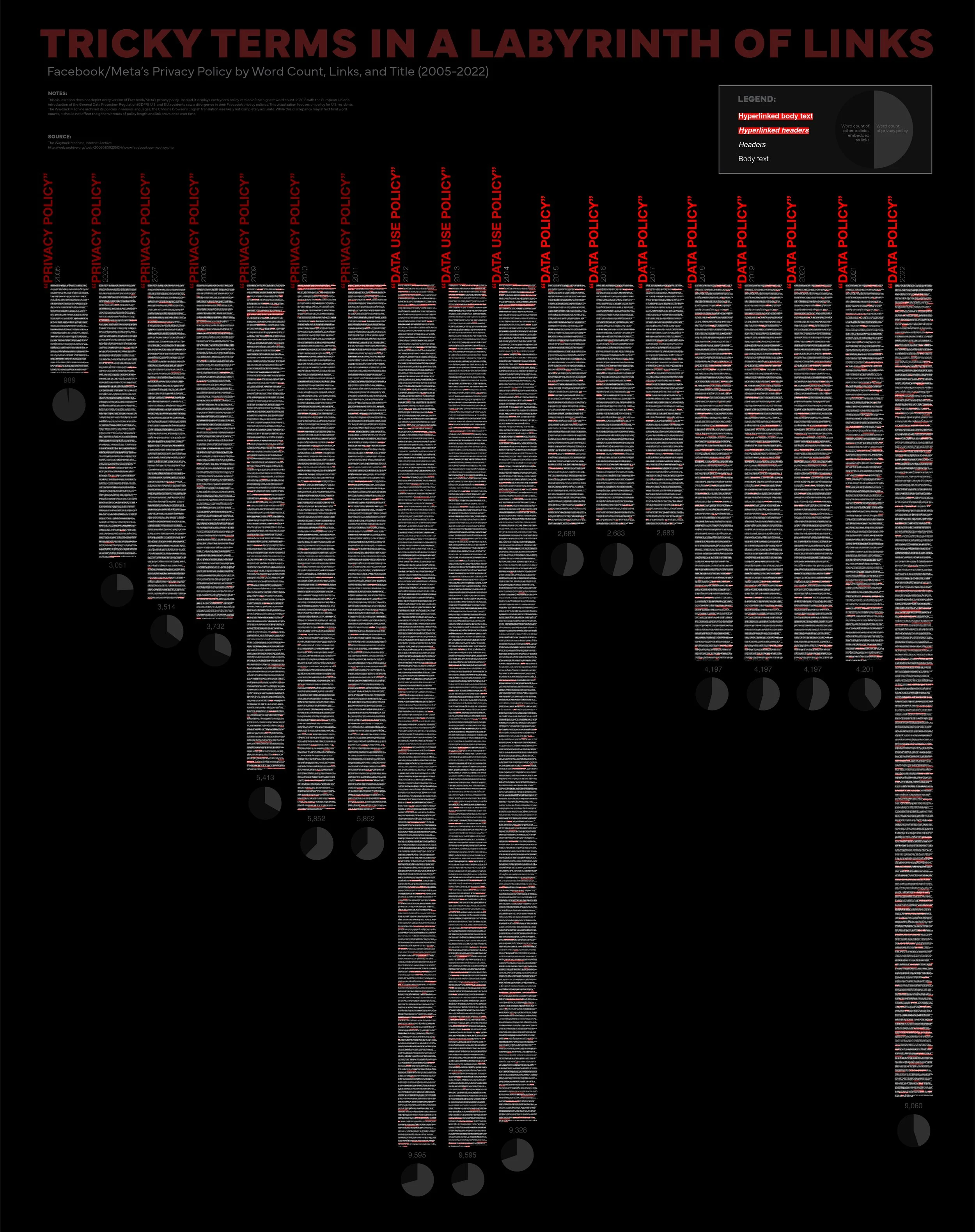 Each bar in this graph is composed of the body text of a given year’s privacy policy. The title of that year’s policy can be found on the top left corner of that year’s bar. Below each bar is a pie chart which depicts the ratio of the policy’s plain text word count (grey) to the policy’s hyperlinked text word count (black). Within each bar, hyperlinked text is bolded, underlined, and highlighted in red (the same goes for hyperlinked headers, plus italicization). With this visual context laid out, we see the stunning evolution of the policy from 989 words in 2005 to 9,089 words in 2022. In 2004, the vast majority of the policy’s word count was plain text, accessible and clear in one place for users; whereas in 2022, the majority of the word count is text which is hyperlinked to other policies, indicating an obfuscation of information. Perhaps most interesting to me is the change in title over time, which distances the company further from any purported value of user privacy, and makes clearer its real intentions: “privacy policy” —> “data use policy” —> “data policy.”